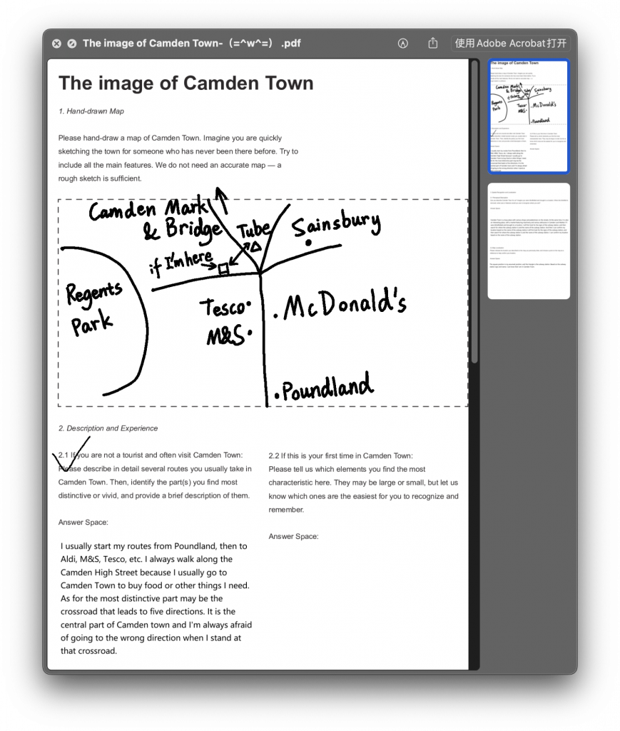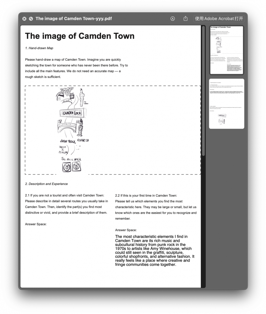 To investigate this, I conducted a study inspired by Kevin Lynch’s experimental methods in The Image of the City. I asked students, both residents and visitors of Camden Town, to draw maps from their mental image of the area. Comparing these sketches with the official boundaries on Google Maps revealed a clear pattern: their mental images were intensely concentrated along Camden High Street, while most residential areas and side streets left minimal impression. This prompted a new question: what specific elements along Camden High Street anchor observers’ memories? In The Town, Perec describes his own mental map—devoid of street signs or numbers—shaped purely by personal memories and interactions. This aligns with Lynch’s theory that environmental images emerge from a two-way interaction between the observer and their surroundings. In this light, Camden High Street can be understood as the part of Camden Town that most actively engages with people, forming the core of its collective image.