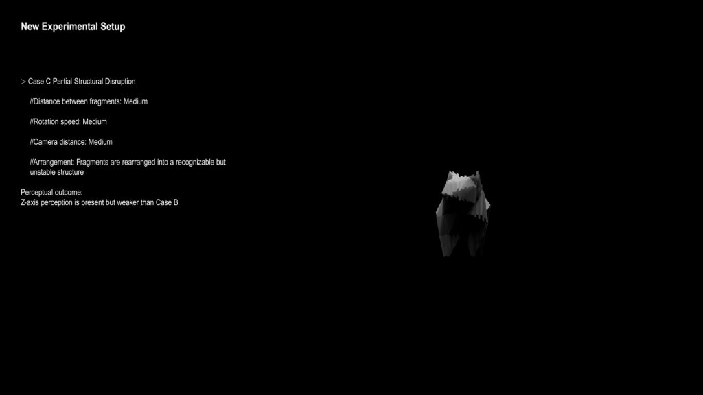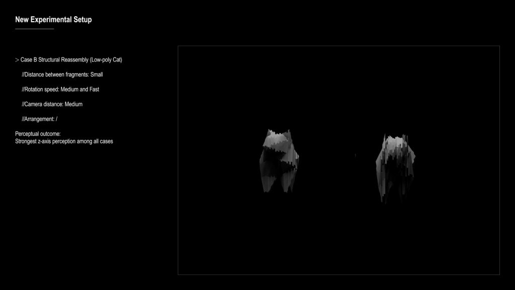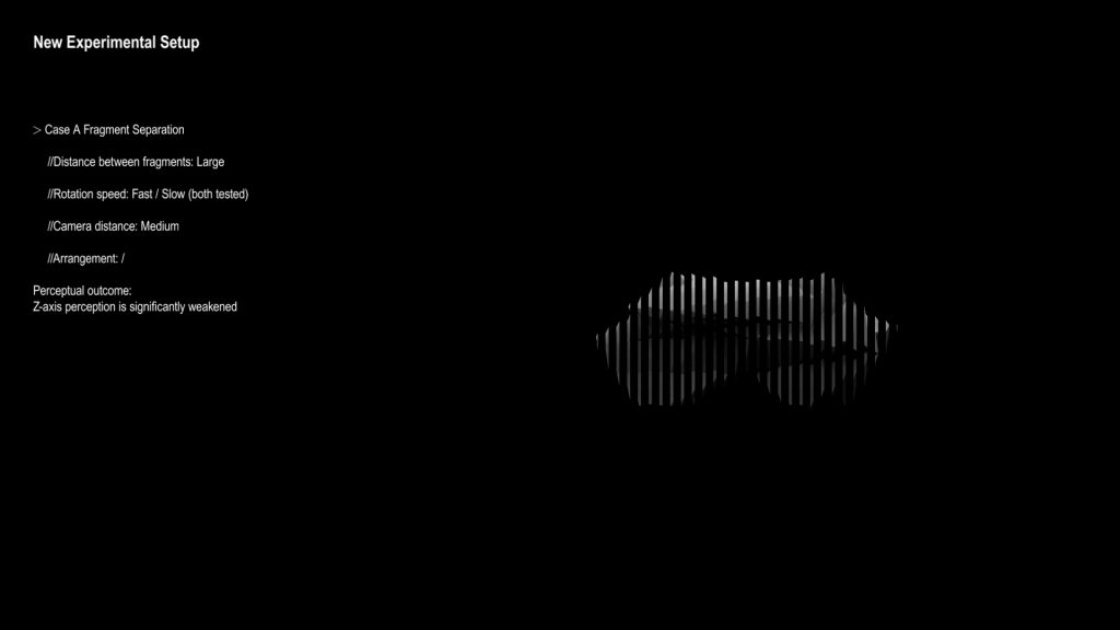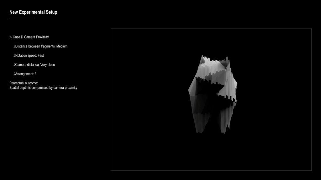 - I worked with a few main variables: the distance of the camera, the rotation speed, and the distance between each fragment.