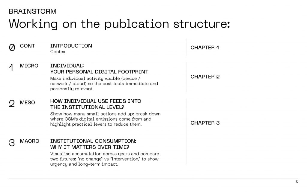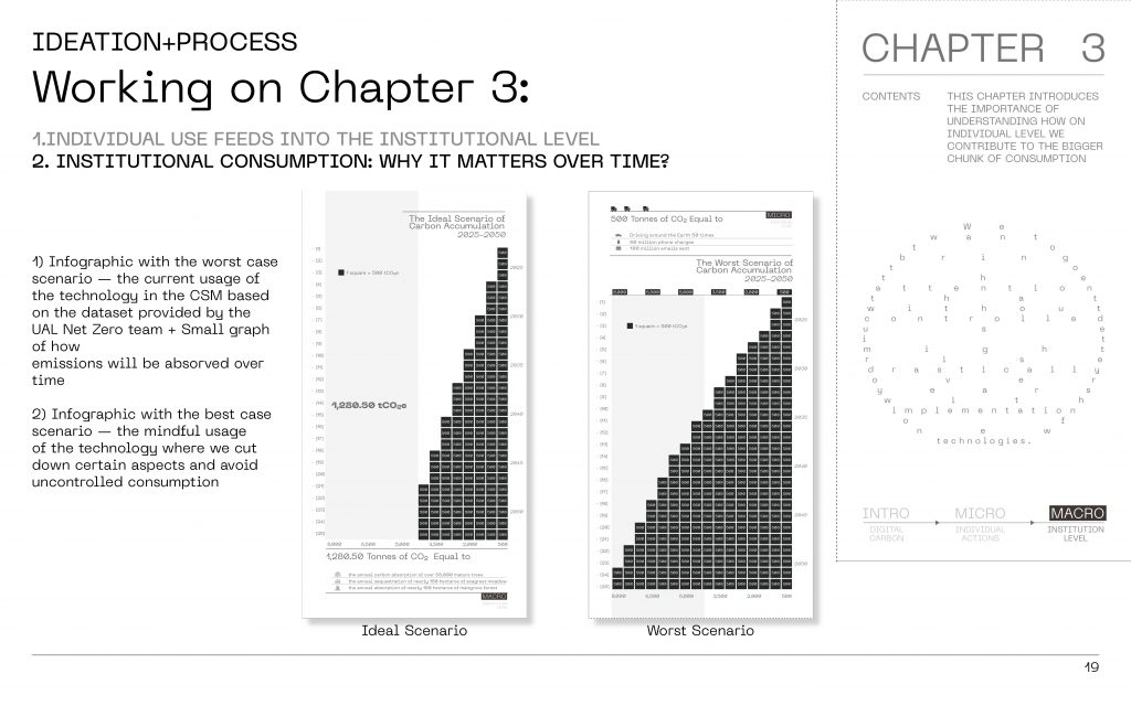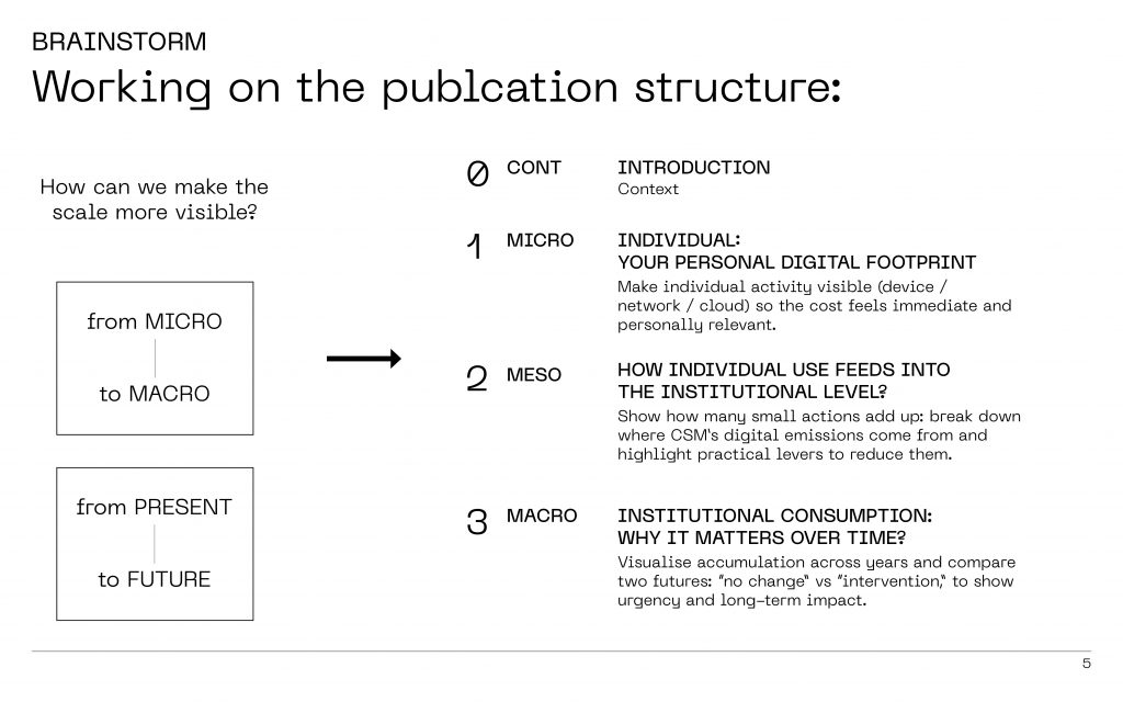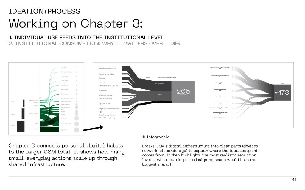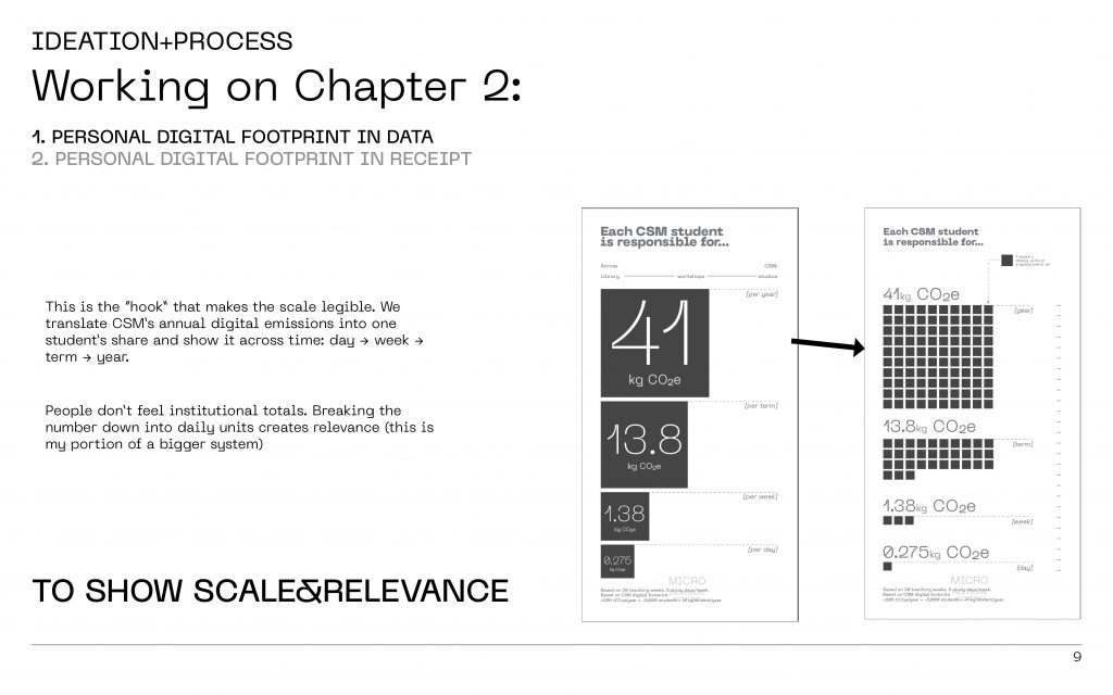 Instead of giving a huge institutional total, we translate CSM’s annual digital emissions into one student’s share, and then we show it over time: day, week, term, year.